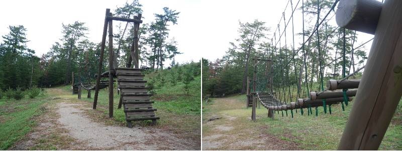 アスレチックの「揺れる橋」は、一般的に「吊り橋」や「ロープブリッジ」と呼ばれ、木の板やロープで作られた、地面から離れて揺れながら進む遊具です。フィールドアスレチックの定番遊具であり、渡る際にはバランス感覚が求められます。木の板とロープで作られ、地面との高低差があるものが多く、揺れが大きいためスリルがあります。複数のロープと、踏み場となる木やロープで構成された橋で、これも同様に揺れながら進みます。「ロープウェイ」や「ジップライン」なども、吊り橋に近い要素を持つことがあります。