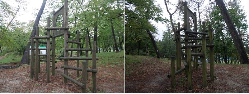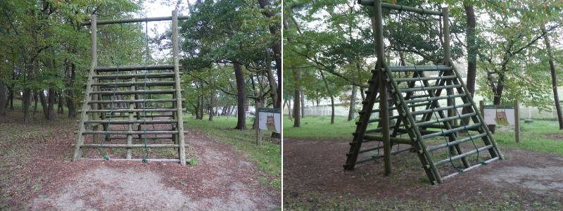 丸太凸凹登り」は、木を丸ごと使い、表面に凹凸が残された状態で、それを登るための遊びやトレーニングを指すと考えられます。アスレチック遊具の一種で、木材を主な素材とするものによく見られます。公園などにあるアスレチックの、丸太を横に並べたり、丸太にロープをつけたりして、手足を使って登っていく遊具を指すことがあります。山中にある自然に倒れた丸太や、公園などにある丸太をそのまま利用したもので、木の自然な形を活かした遊びやトレーニングです。樹皮が残っていたり、木目がはっきりと出ている丸太が使われることが考えられます。全身の筋肉を使い、バランス感覚や体幹を鍛えることができます。木の自然な感触を楽しみながら、自然の中で体を動かすことができます。