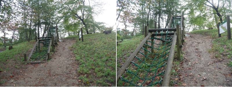 「忍者渡り」という遊具は、おそらく「忍者」の名称がつく、複数の吊り輪や丸太をバランスを取りながら渡っていくタイプの遊具の通称です。明確な定義はありませんが、忍者屋敷の壁などをよじ登るイメージから、子どもが「忍者ごっこ」をしながら挑戦できることからそう呼ばれることがあります。落ちないようにバランスを取りながら進む必要があり、バランス感覚を養うのに役立ちます。バランスを取るために手足を使ったり、体を支えたりするので、全身運動になります。「忍者渡り」のような遊具は、遊びながら「協応動作」や「空間認知力」を養うことができます。