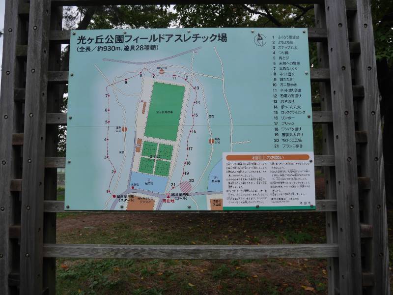 約49haの面積を持つこの広大な公園は、全天候型陸上競技場をはじめ、ナイター設備を持つ野球場、武道館、テニスコート、市民プール等も併設されています。 特に、運動場を囲うように作られたフィールドアスレチックコースが人気で、その長さは全長約930mあり、その途中にある「フクロウ展望台」や「ロッククライミング」、「吊り橋」等の計21種類のアスレチックに挑戦しながら園内を一周することでき、公園の遊具では遊び足りない小学生や大人も一緒に体を動かすことができます。