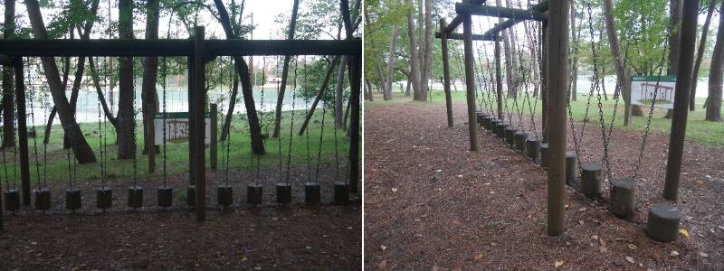 「丸太吊り橋渡り」とは、丸太や木材で作られた丸木橋(丸木橋)を渡る遊びやアクティビティのことです。文字通りには丸太を一本渡した橋を渡ることを指しますが、アスレチック遊具として提供される場合は、丸太や平均台を使って橋を渡る遊具を指すこともあります。丸太や平均台などを探し、谷底にワニがいるなどと想像しながら、他の人と押し合いながら相手を落とさないように渡ります。