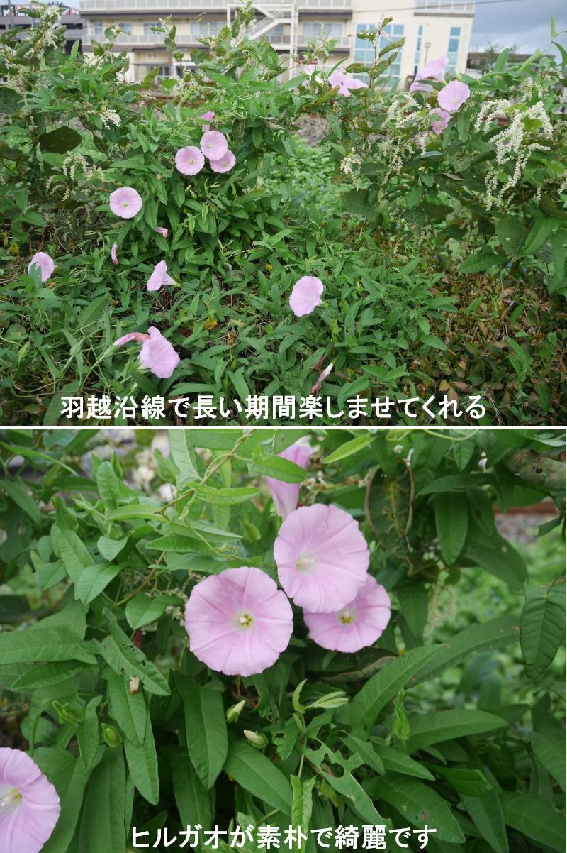 何処でも目にするヒルガオですが、羽越沿線で長い期間楽しめます。朝しか咲かない「朝顔」に対して、昼間もずっと咲いているので「昼顔」と呼ばれます。日当たりのよい場所にふつうに生える多年草で、地下茎をのばしながらどんどん広がっていきます。また地上の茎はつるになってあちこちに絡みつきます。葉には耳のようなものがあります。同じ仲間のコヒルガオはこの耳が真横に張りだし、さらに2つに切れ込みますが、ヒルガオは後ろに張りだし切れ込みません。ただ市内では葉のかたちが中途半端なアイノコヒルガオがかなり多く見られます。6月から10月ごろ、葉のわきから直径5センチメートルほどのピンクの花を咲かせます。https://www.ji3.biz