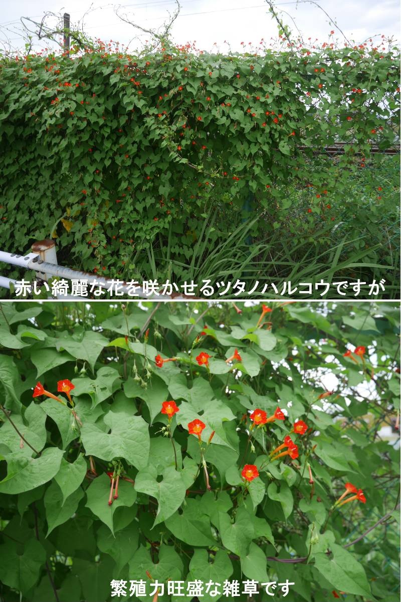 赤い小さな花が沢山あってとても綺麗ですが、繁殖力旺盛な雑草です。ツタノハルコウはヒルガオ科サツマイモ属のつる性一年生草の帰化植物です。葉形は変化が多く、夏から秋にかけて葉腋に花序を出し、直径3cmほどの五角形で朱色の花をつけます。花冠中央付近も赤く、果実は直径8mmほどで熟すると褐色になります。ツタノハルコウは中南米原産です。この植物は急速に広がり、再生力が強いため雑草として分類されています。資源を競合するため、庭の周囲の植物に悪影響を与え、成長を妨げたり、野菜作物の収量を減少させたりします。https://www.ji3.biz