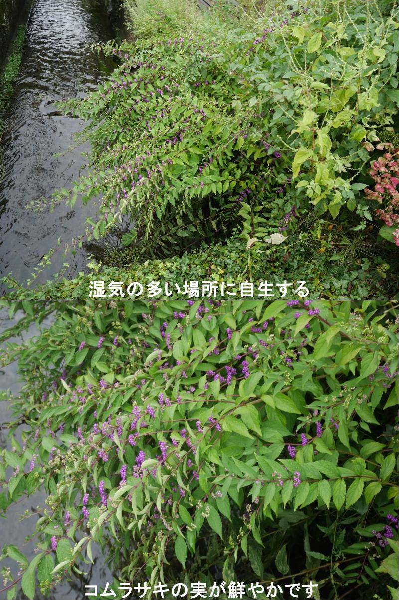 コムラサキの紫色の実がとても綺麗です。コムラサキは、自生はやや湿気の多い場所ですが、庭木として幅広く植栽されています。同属のムラサキシキブとともに平安時代の作家、紫式部にちなんで名付けられました。ムラサキシキブは樹高が3mになる「木」という印象ですが、本種は樹高が1.5m程度に収まり、いわゆる下草として、より広く親しまれています。コムラサキの開花は6~8月で、葉の脇から伸びた花軸に、淡い紅紫の小花が10~20輪が集まって咲きます。果実が紫に熟すのは9~11月で、果実は直径は3ミリほどだが多数が密集し、ムラサキシキブよりも華やかになります。より正確に見分けるためのポイントは果軸の出方で、ムラサキシキブの果軸は葉柄と同じ場所から生じますが、コムラサキは少しずれた位置から生じます。https://www.ji3.biz