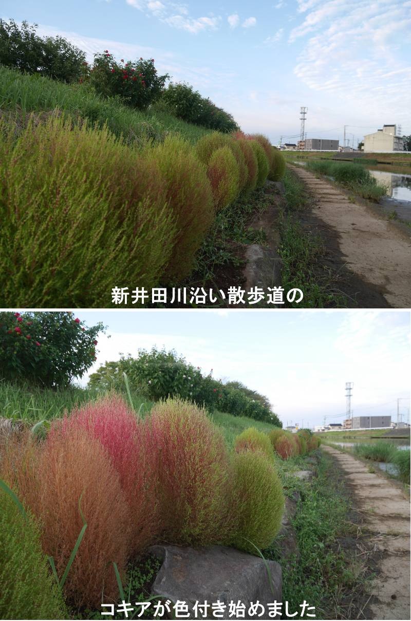 新井田川沿い散歩道のコキアが色付き始めました。コキアは「ホウキギ」とも呼ばれる、夏の緑から秋に赤く紅葉する一年草で、ふんわりとした丸い姿が特徴です。観賞用としては草姿と紅葉を、食用としては「とんぶり」と呼ばれる実を楽しみます。日当たりと風通しの良い場所を好み、乾燥に注意しつつ育てると、こんもりとした美しい姿に育ちます。円錐形で、繊細な茎葉が密に茂り、刈り込みをしたコニファーのような印象を与えます。株をまとめて植えると特異な景観が楽しめます。夏は爽やかな緑色ですが、秋になると気温が下がることで鮮やかな赤色に紅葉します。https://www.ji3.biz