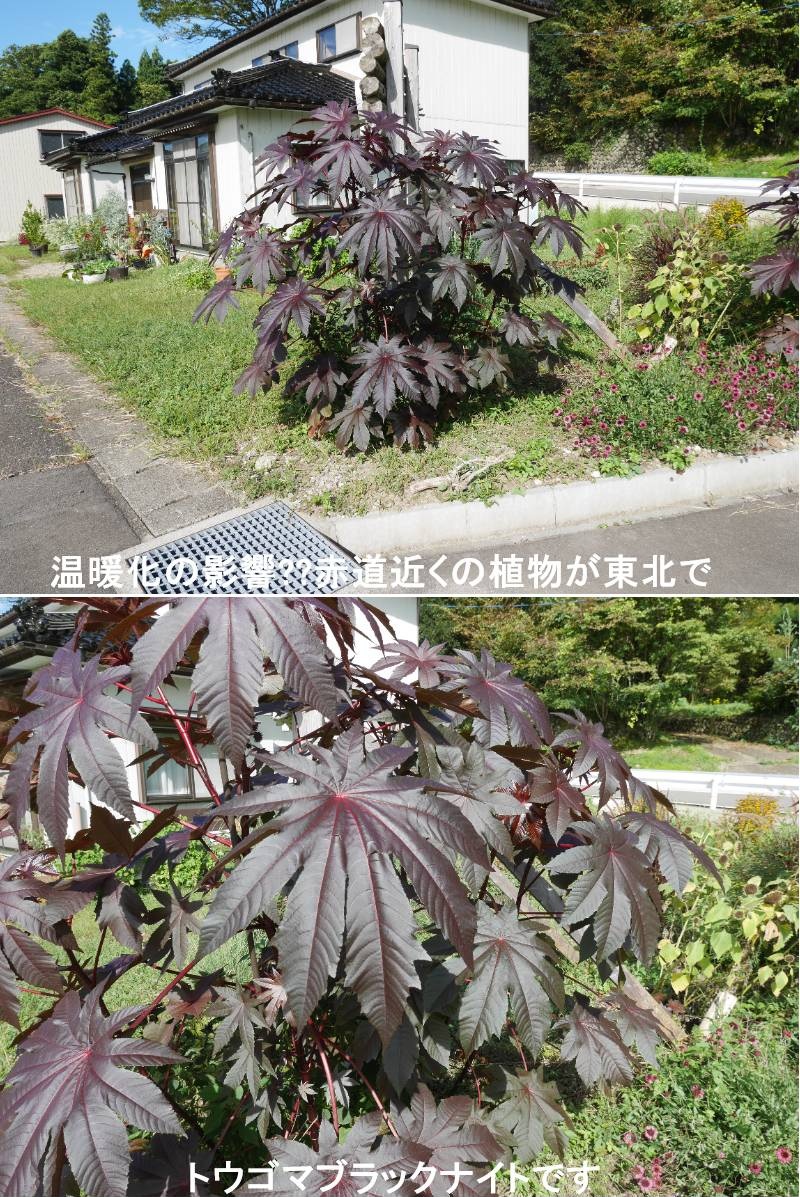 温暖化の影響でしょうか?アフリカあたりの植物が東北でも普通に見られます。トウゴマブラックナイトは、別名をヒマと言います。公園や植物園などで秋の彩りとして植えられているのを見かけることもあります。原産地は東アフリカとされていますが、日本には平安時代以前に、中国から移入されました。唐胡麻の名の由来です。花は雌雄異花で茎の下の方に雄花、上の方に雌花が咲き、柔らかい刺のある果実をつけます。1㎝もある大きな種子を圧搾した油は、低温でも固まりにくいことから、工業用の潤滑油として利用された歴史があります。ひまし油(蓖麻子油)と聞くと、思い出される方もあるかもしれません。https://www.ji3.biz