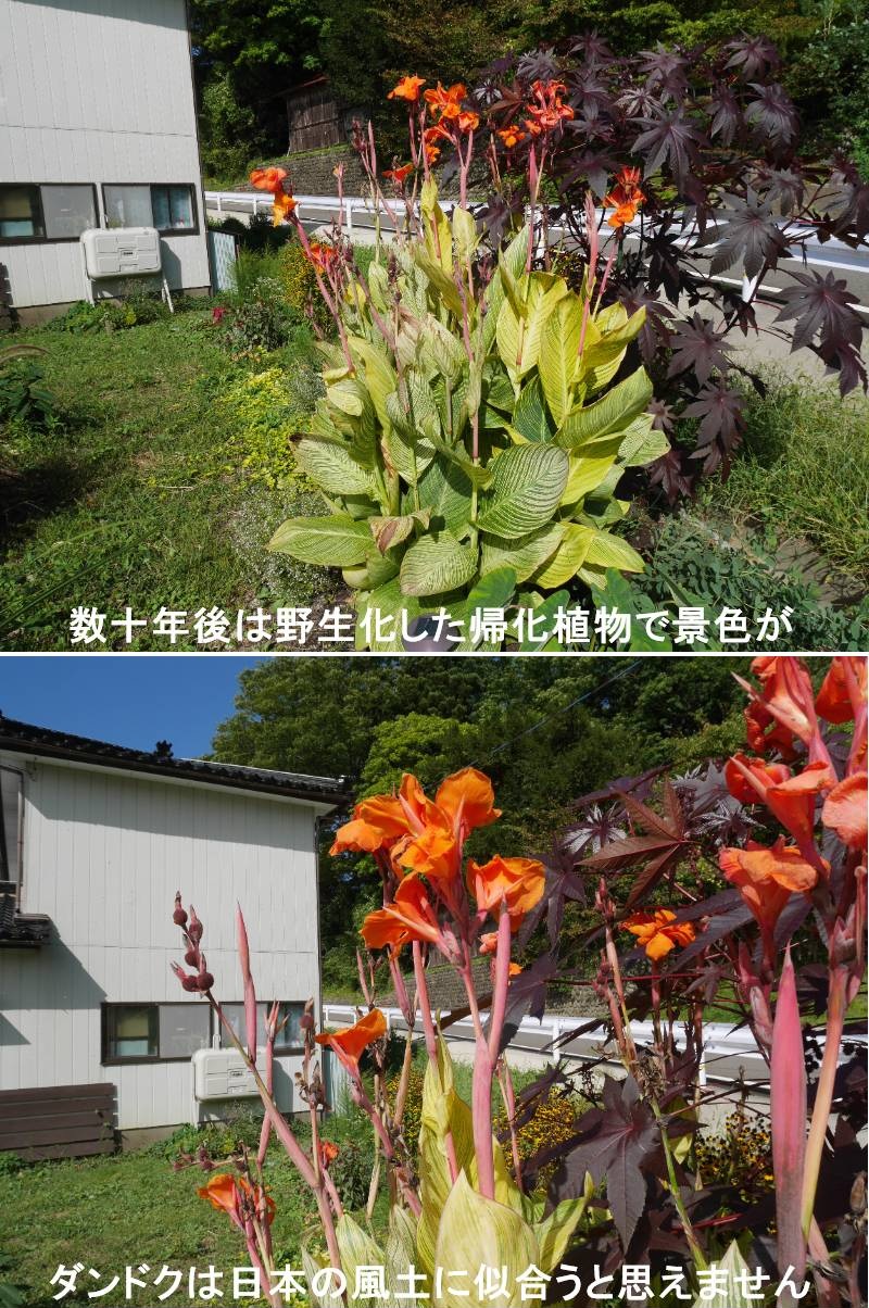 多種多様な外来しょくぶつが庭に植えられ、数十年後には完全帰化し野生化するのでしょうね!!ダンドクは熱帯アメリカ原産のカンナ科の植物で、コロンブスがアメリカを発見した後、タバコ、マリーゴールド、ヒマワリと共に16世紀中にはやばやとヨーロッパに導入された植物のひとつです。日本には江戸時代初期に入ってきましたが、現在では薩南諸島から沖縄まで分布しています。古くから広くアジアなどで栽培されてきた植物ですが、広範囲で野生化しています。草丈1mほどで茎は円柱状で直立し、長さ30~40cmの葉を互生して出します。花は、赤色から黄色の花弁化した雄しべが3個あり、そのうち1個に葯がつきます。https://www.ji3.biz