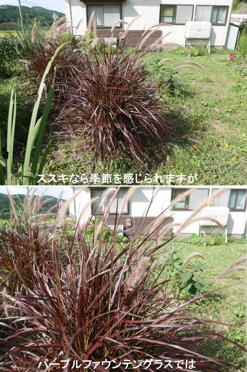 ススキが穂を靡かせれば四季の移り変わりを感じますが、パープルファウンテングラスは、黒色に近い美しい銅葉に赤い涼し気な穂をつけ、夏の暑い花の少ない時期に花壇を涼しげに彩ります。赤い穂はやがて種が熟すと茶色になりますが、種に栄養を取られると生育が穏やかになりますので色が変わる前に取り除いて下さい。イネ科なので暑い時にはどんどん生長しますので定期的な追肥を行って下さい。秋になると葉はより銅色を帯びてきます。土が凍らなければ0℃位までは大丈夫なようですが安全に越冬させる場合は5℃以上必要です。https://www.ji3.biz