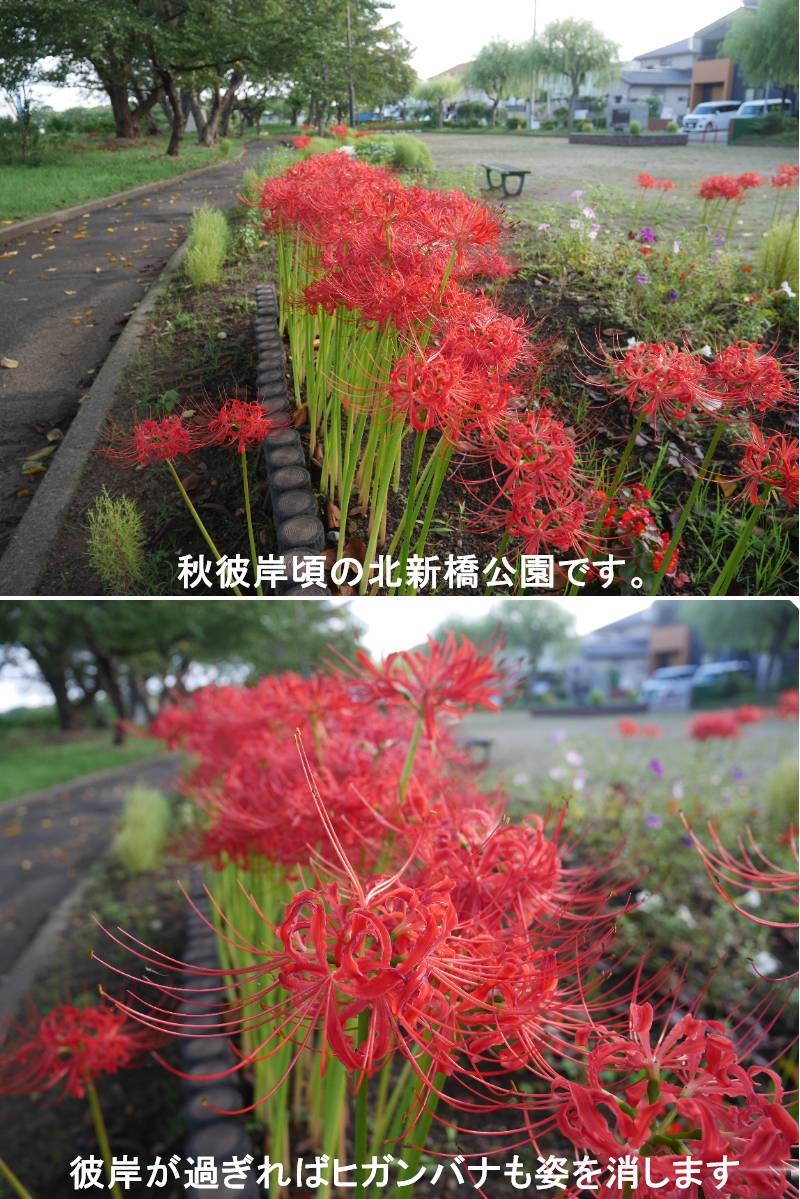 秋の彼岸が過ぎて早や三週間がたちました。彼岸花もそれと併せて見る事がなくなりました。写真は彼岸頃の北新橋公園です。彼岸花とは、ヒガンバナ科・ヒガンバナ属(リコリス属)の多年草で球根植物です。道端や人里に近い川岸、田のあぜ道などに群生し、夏の終わりから秋にかけて咲きます。彼岸花をよく見てみると、高さ30cm~50cmの長い茎に大きな花がポツンと咲いています。では彼岸花には葉はないの? いえいえ、ちゃんとあります!彼岸花の大きな特徴は、一般的な花と少し違うその生態。彼岸花は球根から花が出てきて、その花が枯れた後に葉が成長します。だから葉がない状態で花が咲いているのです。https://www.ji3.biz