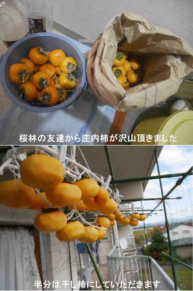 今年も桜林の友達から、庄内柿が沢山(30kgのコメ袋いっぱい)届きました。ありがたいです。ほぼ半分を皮を剥いて吊るし干し柿に、あとは焼酎を吹きかけ密閉し支部塗゛機処理をしました。当分楽しめます。庄内柿とは、山形県庄内地方を中心に栽培されている、種なしのブランド柿です。代表品種は「平核無(ひらたねなし)」で、平たくて種がないのが特徴です。渋柿を脱渋処理することで、とろけるような甘さとみずみずしさが生まれます。果肉の黒い斑点は渋み成分のタンニンが変化した「ごま」と呼ばれ、甘く美味しい柿の証拠です。ビタミンCやカリウムが豊富で、風邪予防や二日酔いにも良いとされています。https://www.ji3.biz