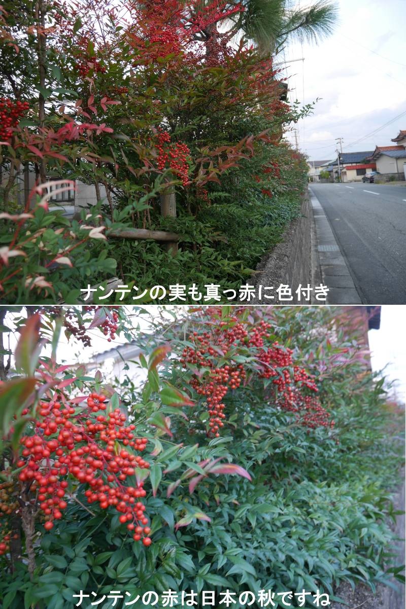 ナンテンの見も真っ赤に色付きました。ナンテンは本州の関東より西、四国、九州など比較的あたたかい地域の山林に自生する常緑もしくは半常緑性の低木です。丈夫で枝もあまり横に広がらず、害虫も少なくて縁起木(後述)でもあるので、玄関先や庭によく植えられています。樹形は株元からたくさんの細い幹をまっすぐに伸ばして、株立ち状になります。初夏になると茎の頂点から花軸を伸ばして、小さな白い花がまとまって咲き円錐状になります。花後につく果実は晩秋から冬にかけて熟して真っ赤に色づき、鳥たちがついばみます。https://www.ji3.biz