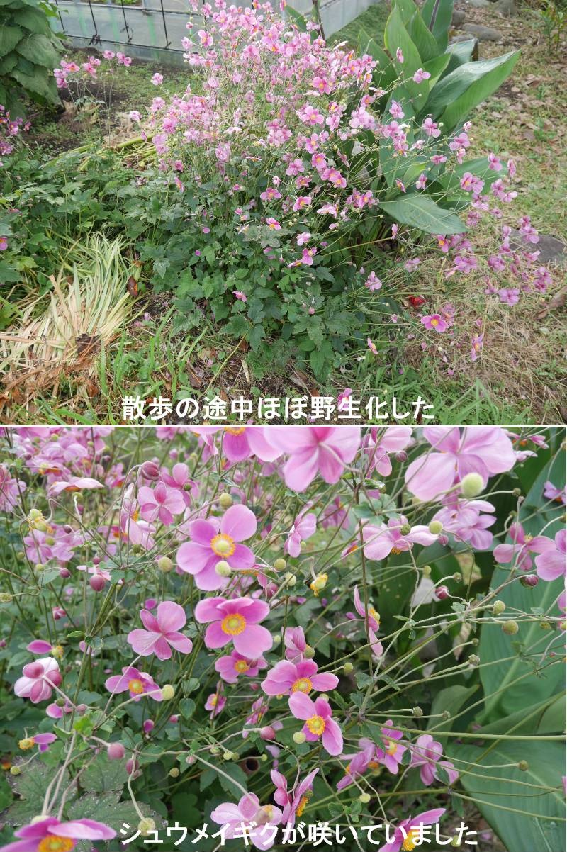 散歩の途中ほぼ野生化したシュウメイギクが咲いていました。わが国へは古い時代に中国から入り、京都の貴船地方に野生化したものが見られます。これがキブネギクで、本来のシュウメイギクです。ただし、現在は類似のいくつかの種や、これらの交配種も含めて、総称的にシュウメイギクと呼ばれています。早春に咲くイチゲの類と同じアネモネ属の植物ですが、性質はかなり異なり、半常緑性の大型の多年草で、地中の根は太く長く伸びて、いたるところから不定芽を出してふえます。夏の終わりごろから花茎が伸び出し、先端にまず1輪、そしてその両わきに1輪ずつ、さらにそのわきというように順に花を咲かせます。https://www.ji3.biz