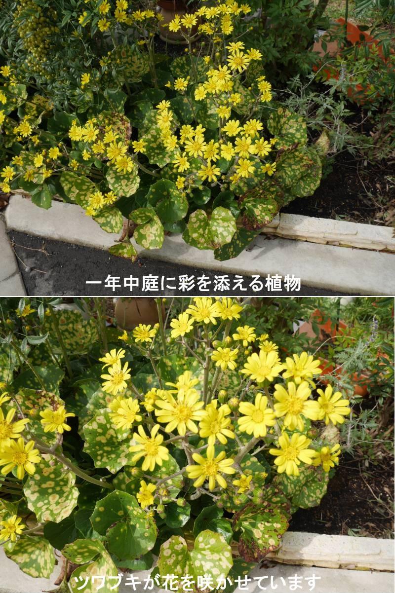 ツワブキは海沿いの草原や崖、林の縁に見られる常緑の多年草です。葉は革質でつやがあり、円くて直径20cm前後あります。新芽は茶色の綿毛に包まれていますが、成長につれて取れていきます。花は株の中心から出て、先端に10~30輪ほどのキクに似た、花径3cm前後の黄色い花を咲かせます。斑入りや八重咲き、丁字咲きなどの園芸品種が栽培されてきました。花色も黄色のほか、クリームホワイト、朱色、レモン色などの品種があります。秋に咲く花だけでなく、斑入りや獅子葉など葉も変化に富み、1年中庭に彩りを添える植物として古くから親しまれています。https://www.ji3.biz