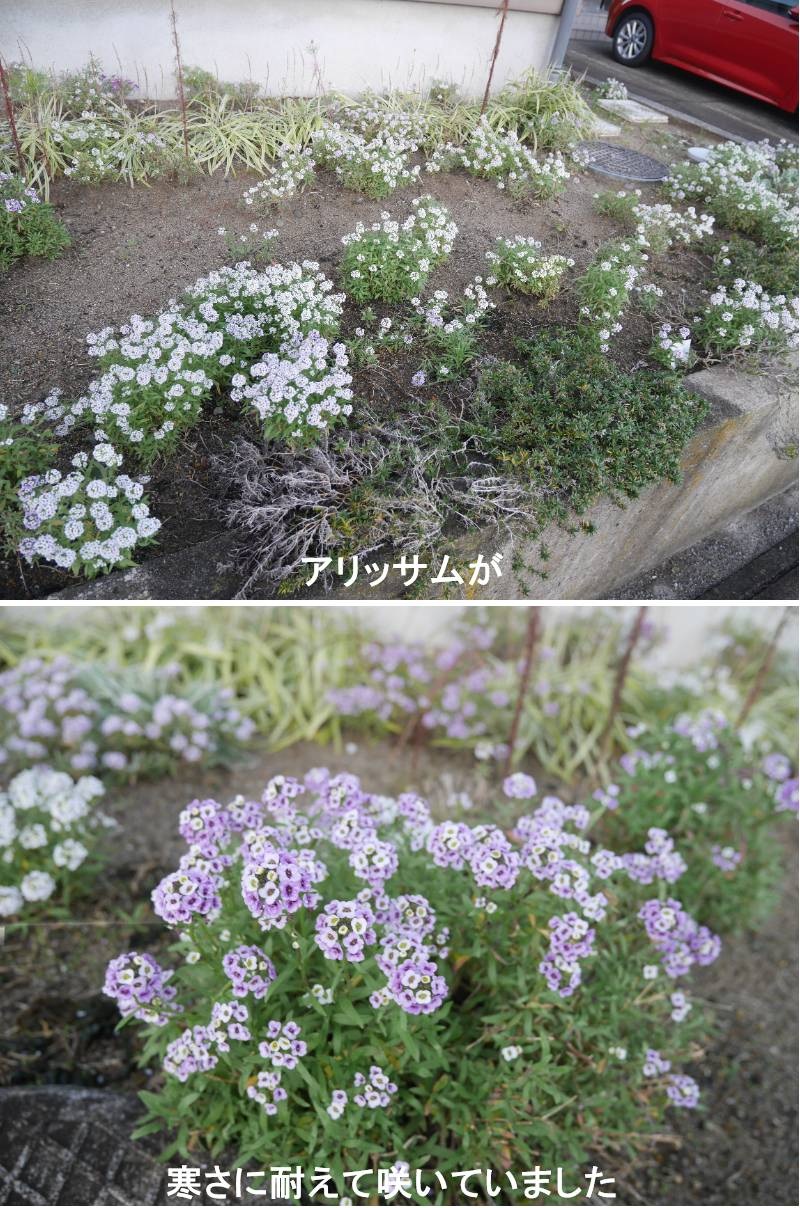 アリッサムが寒さに絶えて咲いています。アリッサムは地中海沿岸原産の多年草です。「スイートアリッサム」の名前でも親しまれています。小花がたくさん咲き、花束のようにこんもりと生い茂る姿が何とも愛らしい植物です。本来は多年草ですが、湿気に弱いため日本では一年草扱いをされていることが多いようです。環境にあえば多年草化することもあります。アリッサムは横に広がる性質を持つので、グランドカバーの他、寄せ植えや花壇に植える花として人気があります。カスミソウのように控えめで愛らしい花で、ピンク、白、紫、オレンジと様々な色があり、自分の好みや庭、プランターの雰囲気に合わせて選ぶことができます。https://www.ji3.biz