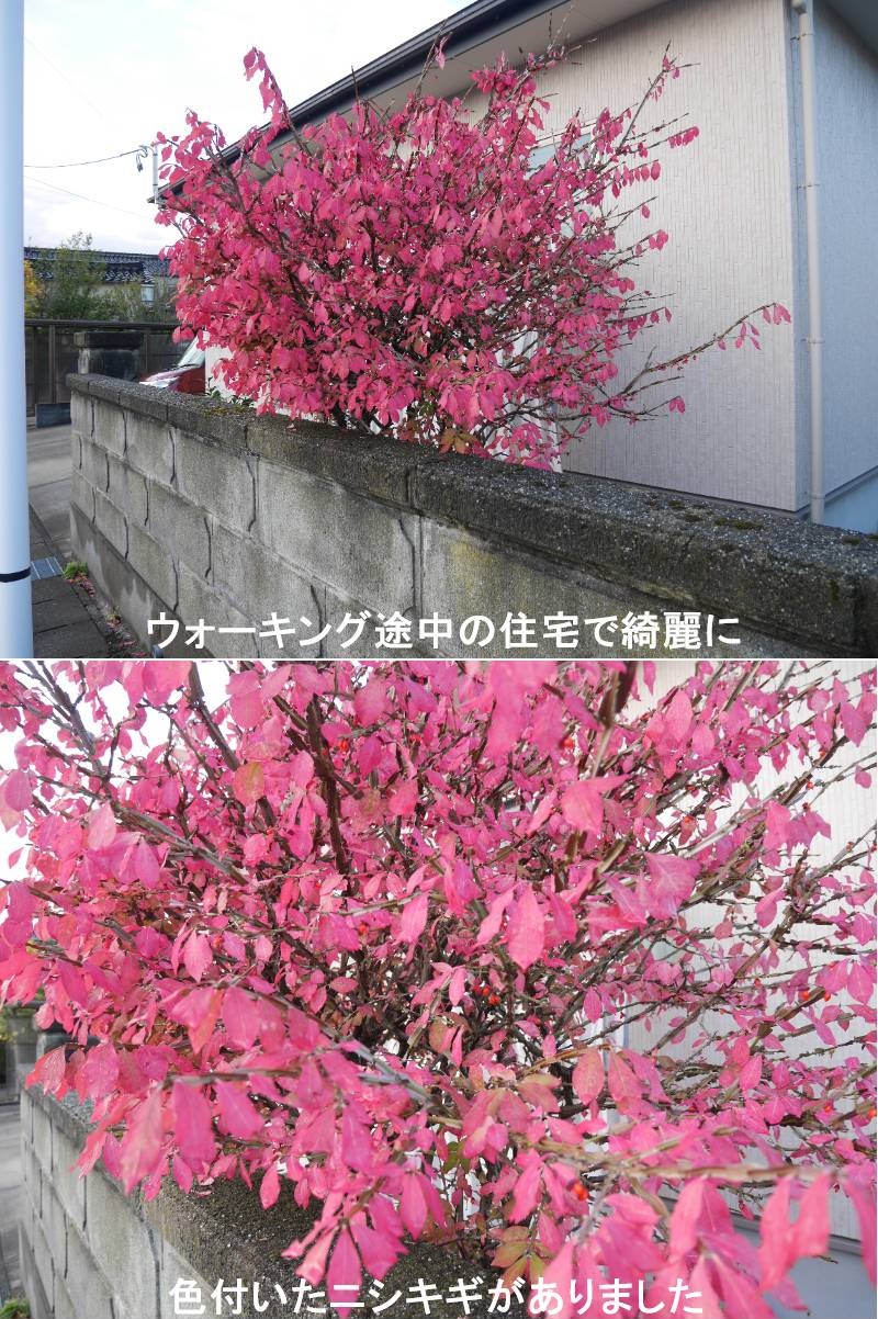 ニシキギも綺麗に紅葉しました。ニシキギ(錦木)とは、ニシキギ科ニシキギ属の落葉低木で、その名の通り絹織物の錦のように紅葉が特に美しい樹木です。枝にコルク質の矢羽根形の翼をもつのも特徴です。 日当たりよい場所を好みますが、耐陰性もあり日陰でも育ちます。 生長が早く育てやすい木です。ニシキギはその名のごとく「錦」を思わす秋の紅葉の美しさが最大の魅力です。小さな果実は秋の深まりとともに熟して果皮が裂ける蒴果で、晩秋に橙赤色の仮種皮で覆われたタネが垂れ下がる姿もかわいらしいものです。https://www.ji3.biz