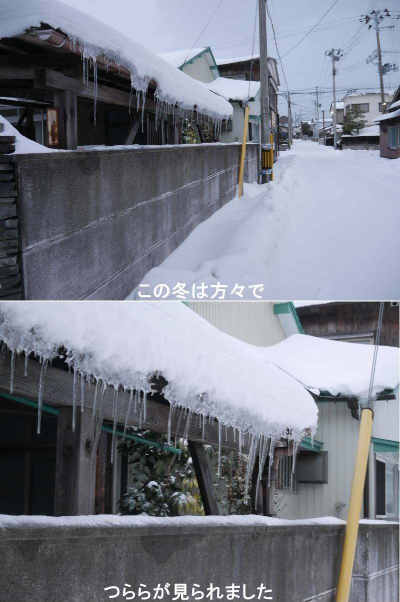 温暖化等と云われていますが、今年の酒田市は十数年ぶりの寒冬のような気がします。降雪量や地吹雪の回数も多かったです。暫くぶりに育ったつららも見る事が出来ました。つらら(氷柱)とは、冬の軒先や岩場などで、雪が溶けた水滴が凍り、棒状に垂れ下がった氷のことです。主に日中の陽射しで屋根の雪が溶け、夜間の冷気で再凍結するサイクルで成長します。漢字では「氷柱」と書きますが、一般的には「つらら」と読み、和語(大和言葉)の「たるひ(垂氷)」に由来します。https://www.ji3.biz