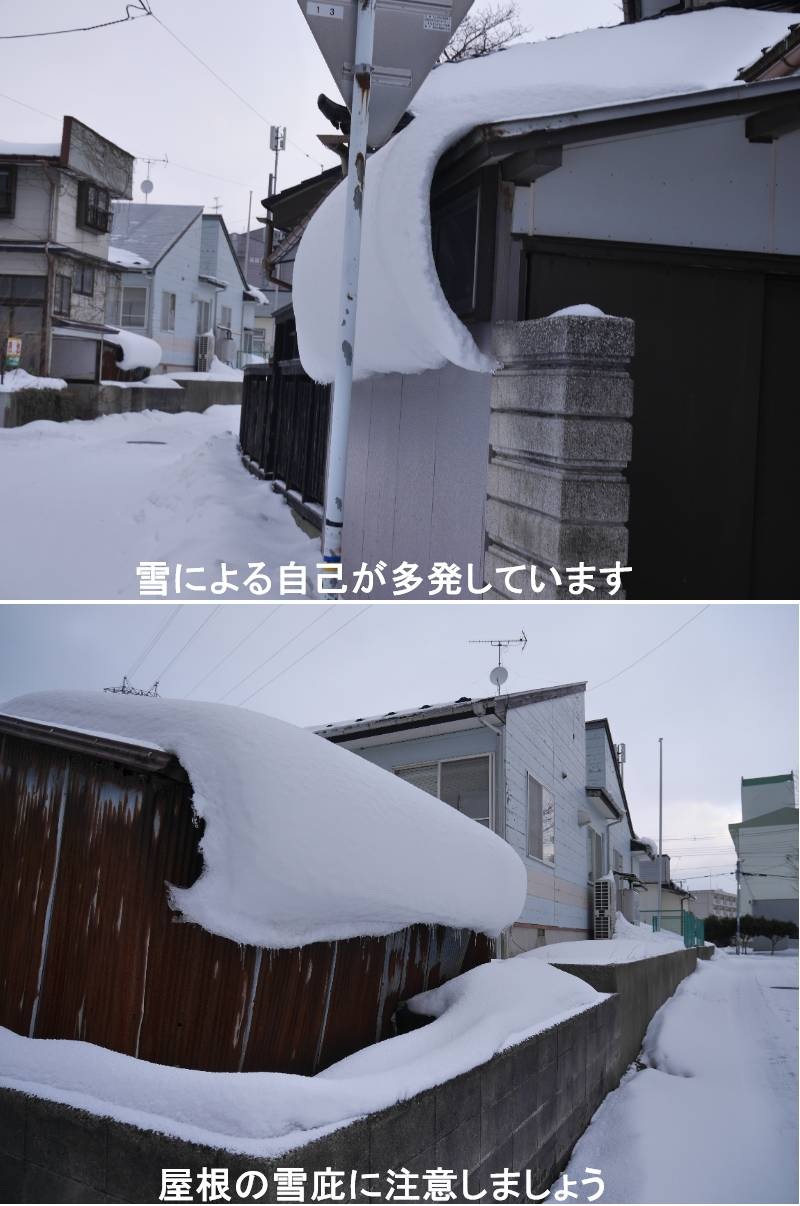 この冬の大雪で、除雪中にお亡くなりになった方が数多くでてしまいました。おいたましい事です。酒田は増設地帯ではありませんが、それでも、例年と比べれば積雪量は多かったです。雪の事故で多いのは、屋根からの落雪です。このところ少し気温が上がり、屋根の雪が雪庇になっているのが気に掛かります。雪庇(せっぴ)とは、冬の山稜や建物の屋根などで、風下側に雪が庇(ひさし)状にせり出して形成される雪の塊です。強風が雪を運んで吹き溜まることで発生し、成長すると崩落しやすく、山では雪崩の誘発や滑落、街中では落雪・人身事故に繋がる非常に危険な冬の現象です。https://www.ji3.biz
