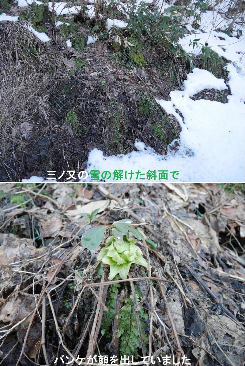 昨日の午前中は、雲一つなく晴れ上がりポカポカ陽気になり、暫くぶりで鳥海山の全景を見る事が出来ました。陽気に誘われて三ノ又に水を汲みに出かけました。山はまだまだ冬景色でしたが、一部雪が溶けた斜面に往路バンケの黄緑色を見つけ、帰路車を停めて頂いてきました。この場所で6個採れました。春の訪れを告げる山菜、フキノトウ。雪の消え間からポコポコと道路端に顔を出すのフキの新芽をフキノトウといい、山形県庄内地方ではバンケと呼ばれるのが一般的です。成長するとフキになります。古名、山生吹(やまふぶき)がフキの名の由来です。キク科、フキ属の多年草です。江戸時代後期に米沢藩が飢饉に備えて作った”かてもの”という本の復刻版 読下し本ではフキについて、「葉も茎も茹でて食う。カテモノとしては灰汁水で茹でずに一晩浸すべす。フキノトウもカテモノとすべし。茹でて、流れ水に一晩さらしておいて苦味を取る」とあります。https://www.ji3.biz