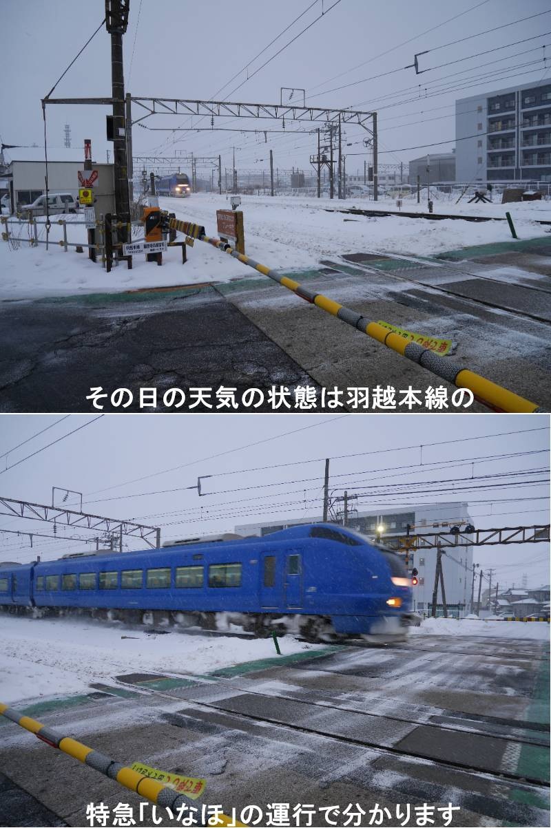 ウォーキングで、何度か踏切を渡る事がありますが、時計を持っていなくてもある程度の時刻を知る事が出来ますし、気象状況も予測が出来ます。この冬は飛島との定期連絡船の欠航が記録的に多いので、羽越本線の特急「いなほ」が止まる事もあります。羽越本線の「いなほ」脱線転覆事故は、2005年12月25日夜、山形県庄内町のJR羽越本線で、強風(突風・竜巻)により特急「いなほ14号」が脱線・横転した大惨事です。橋梁を通過後の6両編成全車両が脱線、先頭車両が小屋に激突するなどして5人が死亡、33人が負傷しました。この事故依頼「「いなほ」は一定以上の風速で列車やを運行しなくなりました。https://www.ji3.biz