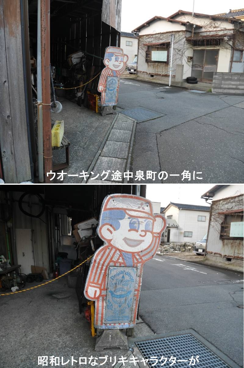 ウオーキングをしていると、色々な物が目に飛び込んできますが、泉町で昔懐かしい昭和時代のガソリンスタンド等で良く見られた、ブリキ製のキャラクター看板がありました。コレクターの間では、「ブリキ看板」やキャラクターをモチーフにしたものは、「マスコット看板」として知られているようです。昭和のブリキ看板は、主に鉄板にスズをメッキした薄い板に、色鮮やかな企業ロゴや商品を印刷した、明治から昭和中期にかけての主要広告看板です。軽量で低コスト、鮮やかな発色と耐久性が特徴で、飲料、たばこ、薬品の看板として大量生産され、街角や商店の壁を彩りました。現在では「昭和レトロ」の代表的なアイテムとしてコレクションや装飾に人気です。https://www.ji3.biz