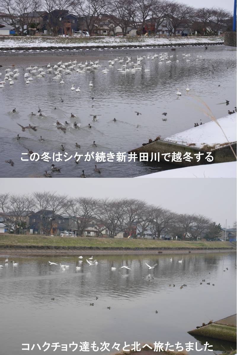 この冬は近年では珍しく寒冬でシケが続いたせいか、例ねんなら最上川河口のスワンパークで多くのコハクチョウが寝泊りするのですが、酒田市内ど真ん中にある新井田川で夜を明かす数が多かったようです。そのコハクチョウも、北へと旅たち日に日に数を減らし、このところ見る事がなくなりました。春の訪れを告げる出来事です。コハクチョウは、冬にシベリアから日本へ渡来する全長約120cmの小型のハクチョウ(カモ目カモ科)です 。オオハクチョウより首が短く、くちばしの黄色い部分が半分以下と小さいのが特徴です。家族単位で行動し、水田の落ち穂や草の根を好んで食べます 。全身白色(成鳥)で、脚は黒いく、くちばしは黒色で、黄色い部分が円く小さいです。https://www.ji3.biz