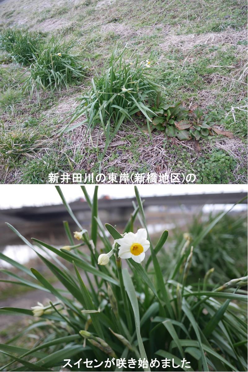 新井田川東岸(新橋地域)のスイセンが咲き始めました。春の訪れを感じることができます。スイセンはイベリア半島を中心に、イギリス、ヨーロッパ中部、北アフリカを含む地中海沿岸地域に25~30種が自生します。房咲きスイセンをはじめとした一部の品種はギリシャから中国にまで分布し、日本にも野生状態で生育しています。RHS(英国王立園芸協会)には1万を超す品種が登録されており、その原種および花形、花色、草姿などから12系統に分類されています。なかでも、代表的な種類に、ラッパズイセン、八重咲きスイセン、房咲きスイセン、口紅スイセンなどがあります。https://www.ji3.biz