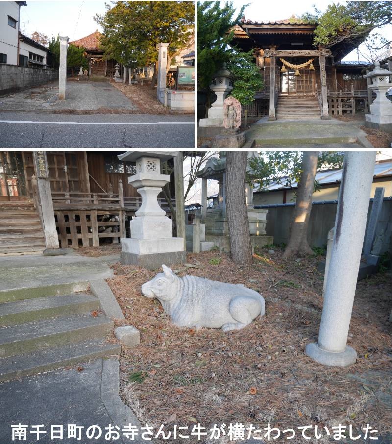 ウオーキング途中のお寺さんに牛が横たわっていたので写真を撮ってきました。酒田市福王寺(ふくおうじ)は、山形県酒田市南千日町にある真言宗醍醐派の寺院で、庄内十三仏霊場の第1番札所です。ご本尊は不動明王で、特に煩悩を燃やし尽くす「お不動さん」として信仰され、疫病退散、家内安全、商売繁盛などのご利益で知られる地域密着の古刹です。五大明王の中心である大日大聖不動明王を祀っています。建立から約300年の歴史を持ち山形七福神の一つである恵比寿様も祀られています。かつては北前船の海上安全や、眼病平癒の祈願所としても栄えた、ご祈祷専門の歴史ある寺院です。https://www.ji3.biz