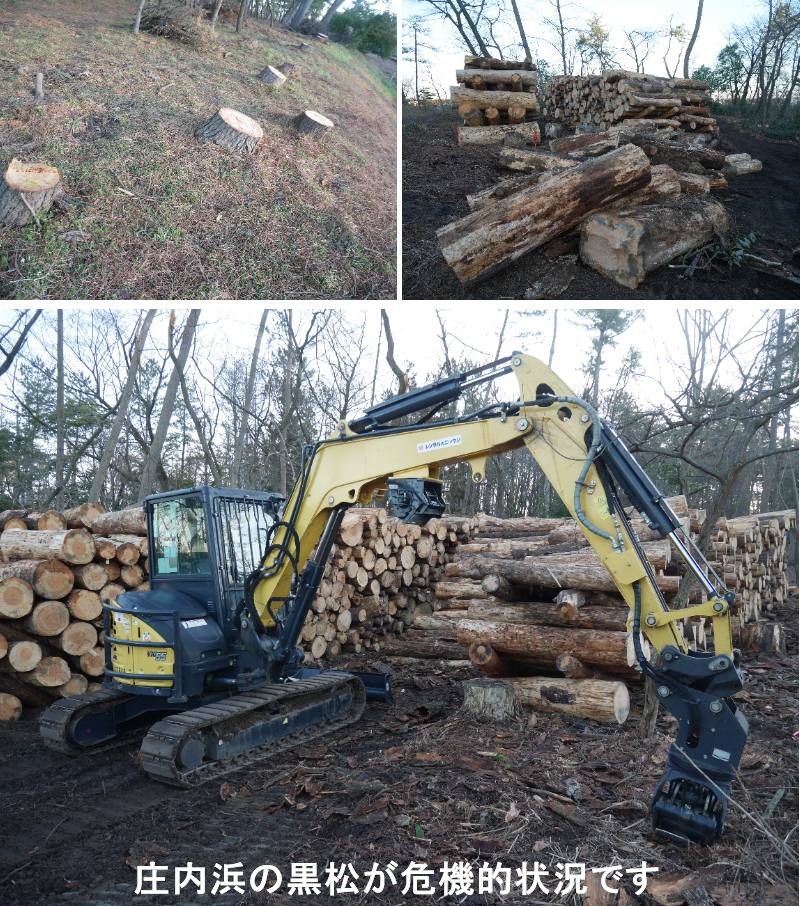 光ヶ丘の黒松を含め、庄内沿岸の砂防林が危機的状況です。庄内砂防林(主に酒田市周辺)では、松くい虫(マツノザイセンチュウ)による被害が急拡大し、過去最大規模の深刻な松枯れが発生しています。高温・少雨の影響で被害木が急増し、倒木や飛砂被害の二次災害が懸念されており、行政による緊急伐採と再生計画が急ピッチで進められています。伐採は北庄内森林組合や出羽庄内森林組合、温海町森林組合のほか、民間の木材会社合わせて6社が中心となって進められています。あらかじめ被害を受けたクロマツにピンクのテープを巻いて目印を付け、道路沿いや家屋の近くにある被害木を優先的に伐採しています。チェーンソーで幹を輪切りにしたり枝を払って処理。業者に運んでチップや木質ペレットに加工し、ストーブ燃料などに有効利用されています。https://www.ji3.biz