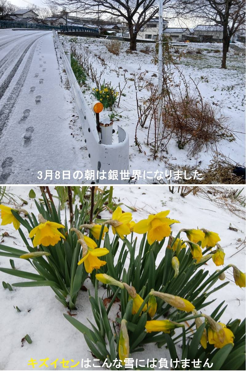 昨日の朝は一面雪景色に戻りました。春が来たと喜んでいた野山の草木もびっくりした事でしょう。それでも、花の咲いたスイセンを見ると、春の気配の方が上回っている漢字がします。それにしても雪とキズイセン合いますね!キズイセンはヨーロッパや北米では野生化しています。日本には江戸時代後期に渡来しました。花に強い芳香があり、精油のナルシス油が得られます。ズイセンは地中海地域および西ヨーロッパの一部に自生する植物です。https://www.ji3.biz