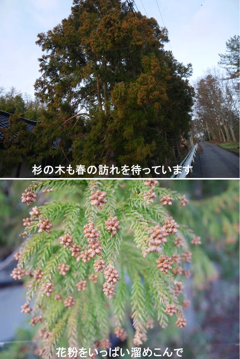 春はすぐそこまできていますが、足踏みをしていて中々進みません。ji3は首を長くして春を待っていますが、待っているのはji3だけではありません。ウオーキング途中の杉の木も今か今かと待っているようでした。花粉をいっぱい溜め込んで!スギの雄花から放出された花粉は空中を飛散し,我々の眼や鼻に達します。スギ花粉は直径30ミクロンでパピラと呼ばれる突起を持つのが特徴です。また,表面にはユービッシュボディと呼ばれる小さな粒子が散在し,この粒子にも抗原性が認められています。2026年のスギ花粉の飛散開始は、東北北部では3月上旬〜4月上旬にかけて飛散が始まる見込みです。https://www.ji3.biz