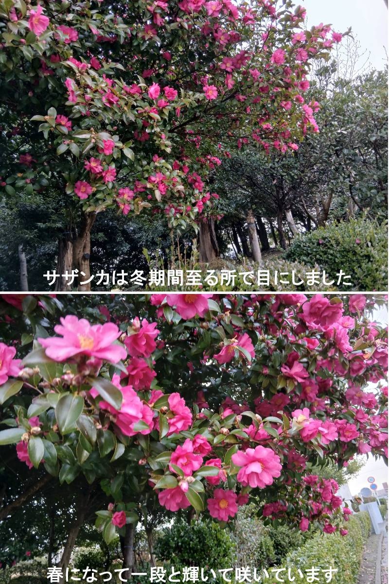 昨年暮から冬期間、ウオーキング中に、欠かさずどこかで、サザンカの花が見る事ができました。見えているのが当たり前なので、格別意識はしなかったのですが、この時期になって改めて、寒い季節の癒しになっていた事に気づきます。春になって一段とその存在をあらわに咲き誇っています。サザンカはツバキ科ツバキ属の一種で、日本の固有種です。基本的な性質はツバキと似ていますが、以下の点で区別されます。新梢と葉柄、葉の裏表の中央脈、子房に短い毛があり、花弁は基部で合着しないので花が終わると1枚ずつばらばらと散ります。ツバキは早春から春にかけて咲くのに対し、サザンカの野生種は10月から12月に白い花が開花し、晩秋の花として親しまれてきました。https://www.ji3.biz