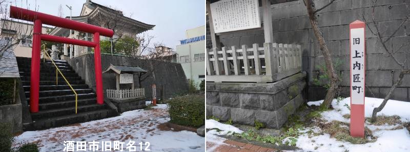 中町一丁目市営地下駐車場隣の天満宮前に標柱があります。酒田市の旧上内匠町とは、「内匠町(たくみちょう)」という江戸時代から続く酒田の旧町名の一部で、明治・大正・昭和初期まで存在し、現在(昭和40年代以降)は住居表示の変更により「中町」や「本町」などの一部に再編されていますが、その歴史や地名に親しむために保存された標柱や資料、地元での呼び名(「たぐまぢ」など)にその名が残る、酒田湊の繁栄を支えた商人町の名残です。「肝煎(きもいり)の斎藤内匠(ないしょう)によって町割がなされた」ことに由来するとされ、浅野内匠頭と同じ「たくみ」と読まれる歴史ある町名です。醤油蔵や商家が並ぶ本町通り周辺のエリアを指し、かつては最上川の舟運や海上交通で栄えた酒田の商業の中心地でした。
