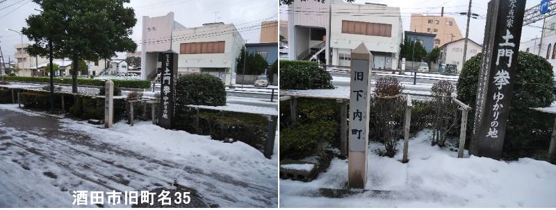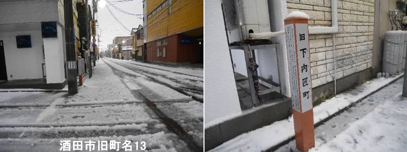 】中町二丁目の最上屋旅館の近くに標柱があります。酒田市の「旧下内匠町」とは、かつて存在した酒田市の古い町名の一つで、住居表示変更(町名変更)により現在の地名に変わりましたが、地域名や自治会名として「下内匠町」の名称が今も残っています。江戸時代に形成された「酒田町・内町・米屋町」などの旧町名が昭和30年代まで使われ、その後、新しい住所表示(住居表示)の実施に伴い変更されたもので、「内匠(たくみ)」の名の通り、町割りに深い関わりがある地名です。忠臣蔵の浅野内匠頭と同じ読みで、正式には「たくみ町」と書かれ、口頭で「たぐ町」「たぐまぢ」と略されて呼ばれることもありました。現在でも中町3丁目などに「下内匠町自治会」が存在するなど、地域には旧町名が引き継がれています。