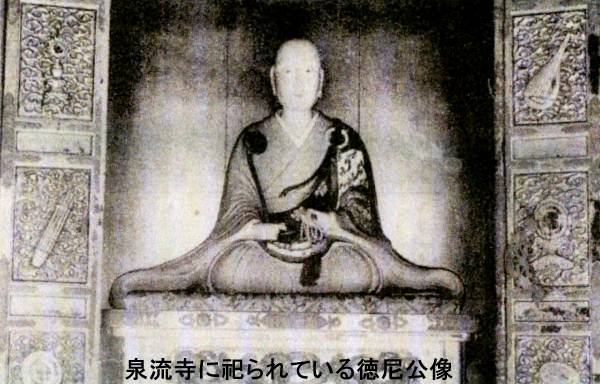 酒田の町は、古くは「向う酒田」と呼ばれる最上川南岸の袖の浦(宮野浦)にありました。12世紀の末、藤原氏が源頼朝に滅ぼされた時、藤原秀衡の妹・徳の前、あるいは後室・泉の方ともいわれる女性が、36人の遺臣とともに袖の浦に落ち延びてきたのが、その始まりといわれています。この地で藤原一門の冥福を祈りながら余生を送った女性は、今からちょうど800年前の建保5年(1217)、静かにこの世を去りました。戒名は「洞永院殿泉流庵徳尼公」です。その後、36人の遺臣は地侍として船問屋を営み、地元民の先に立って湊の繁栄を支えました。また、長人(おとな)あるいは36人衆と称して、湊町の町政を担ったと云われています。徳尼公(上図像)は、現在も泉流寺(酒田市中央西町)内の徳尼公廟にまつられ、毎年4月15日には36人衆ゆかりの人々が集まり、供養を行っています。