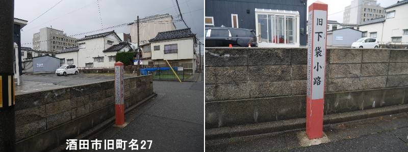 NTTの裏通り料理屋富重の近くに標柱があります。長人(おとな)と呼ばれる三十六人衆が中心となり、西浜の砂原を開拓し酒田の町並を作ったといわれます。旧暦4月中の申の日(日枝神社祭礼の日)、太陽が日本海へ沈む真っ直ぐの線(正中線)を選び、一ノ丁から七ノ丁まで仕切り、本町と名付けました。ここが酒田町組の中心となり、この通りを軸として栄えました。酒田では東西の縦軸を「通り」、南北の66の横軸を「小路」としました。一説には最上川に沿って町割をしたとも言われています。この町割はそのまま残り、現在の酒田の町並を作っています。下袋小路.は行き止まりの袋小路でした。