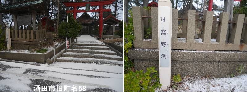 北新町二丁目の稲荷神社前に標柱があります。酒田市の「旧高野浜」は、かつて遊廓があり賑わった歴史的な地名で、現在の酒田市新町の一部にあたり、「弘法大師の腰掛石」が残る村社稲荷神社(北新町)周辺がその中心地でした。最上川の河口近くに位置し、明治大震災で大きな被害を受けましたが、酒田の繁栄を歌った「酒田甚句」にも登場するほど、かつては港町の中心地として栄えた場所です。酒田港の繁栄と共に今町・船場町に娼家が数戸でき、これを茶屋と称していたが、文化10年(1813)3月初めて今町の茶屋37軒、船場町の茶屋36軒が公に認められた。高野浜の茶屋はそれより遅く文政4年(1821)に公認されました。以降酒田町三遊所として諸国に名を知られていました。明治27年(1894)の庄内地震で今町と船場町が大きな被害をうけると、遊郭は新町(高野浜)に移転しました。