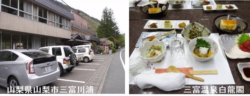 三富温泉郷は笛吹川上流の三富地区に湧く「一の橋温泉」「川浦温泉」「三富温泉」の総称です。日帰り温泉を含め4軒の入浴施設が点在し、趣の違う温泉が楽しめます。国内屈指の景勝地「西沢渓谷」にも近く、ハイキングやトレッキング、また療養としても最適な温泉地です。周囲には国宝に指定されている「清白寺」や伝統ある神社「大井俣窪八幡神社」など、重要文化財や史跡も多いです。これらを巡る温泉旅を計画するのもおすすめです。さらに山梨といえば郷土料理「ほうとう」や桃、ぶどう、さくらんぼなどのグルメが外せません。ほうとうを提供する食事処は多いので、食べ比べをしてみるのもおすすめです。白龍閣は、国道140号雁坂みち沿いにある温泉旅館です。たたずまいは古く昭和を感じられます。館内は老朽化している個所も目立ちました。
