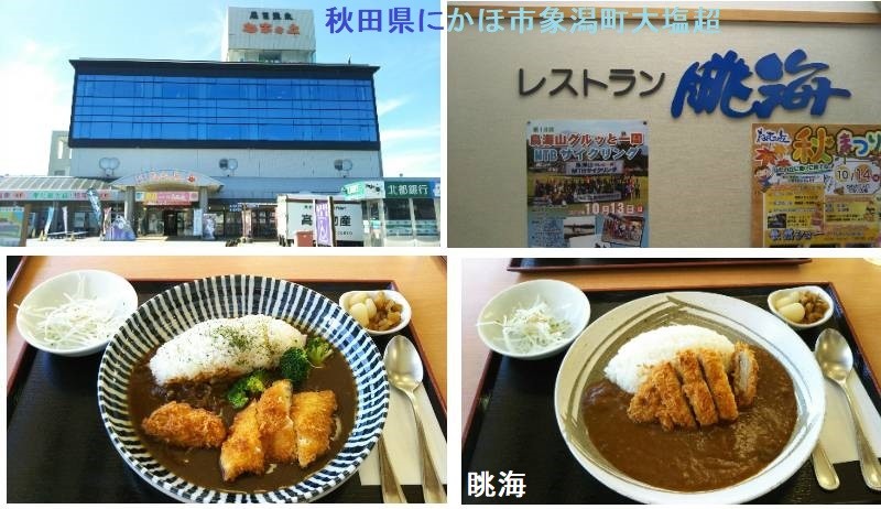 レストラン眺海 は、「道の駅象潟ねむの丘」に入るレストランです。国道7号線沿いの道の駅併設のレストランでランチタイムにします。2階にあるのですが、窓から日本海を眺めることができます。それが屋号の眺海になったのだと思いますが、もう一つ、鳥海山の「ちょうかい」も兼ねていることがわかります。海あり山ありの良いところです。レストラン西側の窓は「オーシャンビュー」で、水平線まで見渡せる夕陽の絶景ポイントでもあります。東側の窓からは、晴れた日は鳥海山の全容が望めますので、海と山の両方の景色を満喫しながらのお食事は、自然の中に包まれるような心地よさがあると大変好評です。