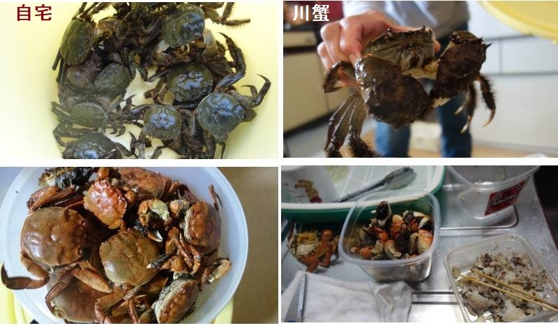 昔より近くの小川などで見かけたモズクカニです。海で生まれて、川で育ち、また、海に帰って産卵をします。古くから川ガニやエガニ、ツガニなどと色々な地方名がつけられ、非常に身近で親しまれてきたカニです。昔はどこの川にでもいたはずなんですが、近年は数が激減しており、中々まとまって獲れることがなくなってきています。爪にある毛が特徴で、英名は「ミトンクラブ」と呼ぶようです。本種のカニ味噌は、非常に濃厚で美味です。また、味噌汁などに入れても、非常に良いダシが出ます。特にメスの内子は珍味として知られており、夏の終わりから秋にかけて内子を持ち始める時期になるとメスは高値で取引されるようになります。秋頃に人気が出て高価になるメスと比べて、オスは安価に流通します。昔は酒田市の実り橋の新井田川でも沢山捕れました。近年は由利本荘市に買いに行きます。