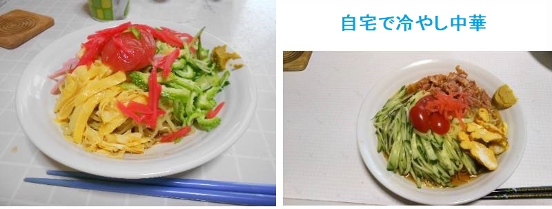 冷やし中華とは、茹でた中華麺を冷水で締めるなどして冷やしたものを使った日本の麺料理です。野菜、叉焼や金華ハム、錦糸卵などの色とりどりの具材を麺にのせて、冷たい酢醤油、胡麻だれ、味噌だれなどをかけて食べます。薬味として紅生姜・からし・マヨネーズなどが添えられることもあります。暑い夏には適した御馳走で、我が家の定番メニューになっています。家庭菜園の採れたて新鮮野菜も豊富に使います。