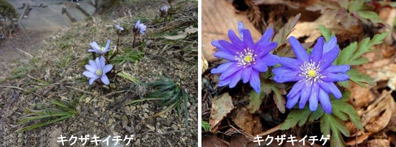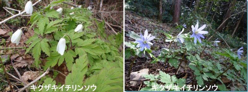 春の訪れを告げる、スプリング・エフェメラル(春植物)の一つです。早春の雪解けの頃から咲き出します。名は花がキクに似ることに由来するそうです。花は同じキンポウゲ科のアズマイチゲによく似ますが、アズマイチゲが白色だけであるのに対して、白色から淡いブルー、淡紅色そして紅紫色と変化に富みます。キンポウゲ科のキクザキイチゲに花弁はありません。花弁のように見えるのは萼片です。萼片が花弁の役割も担っています。 萼片の数は図鑑には「8〜13個」とありますが、実際にはもっと変異があります。山地の落葉樹林内に生える多年草です。高さは10〜20cmほどです。茎葉は3個が輪生し、3出複葉で小葉は羽状に深裂し、鋸歯があります。葉はほぼ水平に展開し、アズマイチゲのように垂れ下がりません。葉の形状や生え方が、アズマイチゲと識別する一番わかりやすいポイントです。地面から葉までが茎、葉から花までが花柄です。花柄には毛が生えます。アズマイチゲの花柄は無毛と有毛があるので、毛の有無だけを見て識別することはできません。萼片、葯、花糸は白色。花糸は基部まで白色で、基部が紫色になるアズマイチゲとの識別ポイントになると思います。