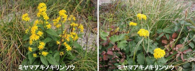 ミヤマアキノキリンソウはキク科の植物。別名コガネギクといい、夏の終わり、秋の気配が濃厚になったころ、高山帯を黄色く彩る高山植物です。北海道から、本州北部以北に分布し、高山帯であれば比較的どこにでも生えている普通種です。高山帯から亜高山帯の草地に生えますが、岩場や礫地などにも生えることがあります。草丈は20~50cmで、花は茎の先端に集まって咲くことが多いです。よく似たアキノキリンソウは低山から亜高山帯近くに生え、花は茎の途中からも多く咲き、花の下部である総苞がミヤマアキノキリンソウに比べて細いです。とはいえ、中間的な形のものもあり、見分けるのは難しいことも多いです。ミヤマアキノキリンソウは、亜高山~高山帯の草地などに生え、茎の高さは15~70センチ。茎頂や葉腋から伸びる円錐状花序に、直径1.5~2センチの黄色の頭花をかたまってつけます。頭花は中心の筒状花と、その周りの舌状花からなっています。総苞は広鐘形です。総苞片は3列で、先が尖っています。下葉は長楕円形~卵形で、先がとがり、基部は細くなって葉柄の翼につながる。葉の両面に細かい毛があります。上葉はしだいに小さくなり、幅も狭くなります。