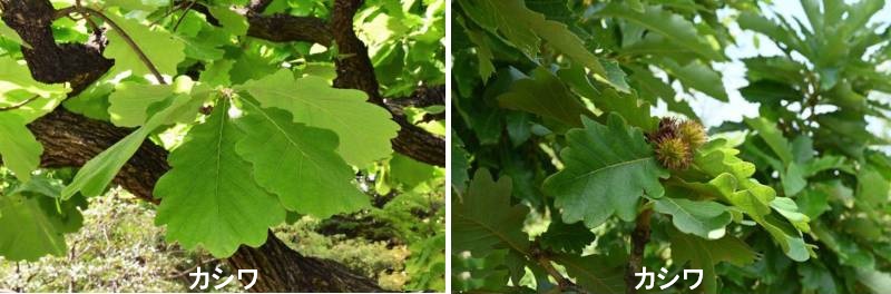 カシワ餅を包む葉でおなじみのカシワは、痩せ地や乾燥に強いので、海岸の丘陵、岩礫地に群落をつくることが多いです。5月5日の端午の節句にお供えされるカシワ餅に葉が使われる木で、寒冷地に多い。丸く尖らない波形の鋸歯をした大きな葉が特徴です。冬になっても一部の葉が枯れたまま落葉せずに残るので、ユズリハと同じく子孫繁栄を象徴する縁起の良い木とされています。ドングリはクヌギに似て卵球形で、下部は総苞片が密生する殻斗に包まれています。 和名は、その葉に料理を盛ったり、食物を蒸したりする時に使ったことから「炊(かし)ぐ葉」の意味から。昔は、料理に使ったり食べ物を盛ったりする葉は、どれもカシハと呼ばれていました。柏餅は、平たく丸めた上新粉の餅を二つに折り、間に餡をはさんでカシワの葉で包んだ和菓子のこと。5月5日の端午の節句の供物として用いられています。カシワとミズナラは、同じブナ科コナラ属に属し、葉がラセン状につくこと、葉柄がほとんどない点で良く似ています。両者の葉を比べると、カシワの葉は大きく、縁は大きな波形ですが、ミズナラの葉は小さく、縁は鋭い三角状をしている点で容易に区別できます。