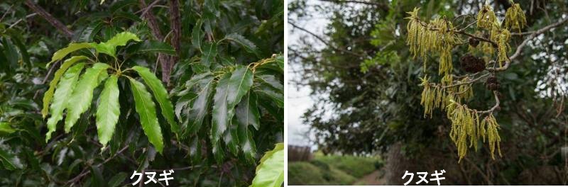 クヌギは山形県、岩手県を北限に沖縄県まで広く分布しています。樹高15メートル以上の大木になります。コナラと並んで武蔵野の雑木林の主役です。ブナ科の実を総称してどんぐりと呼びますが、どんぐりとは団栗と書き、団とは丸いという意味だそうです。丸い栗のような実、といった意味でしょうか。縄文時代には、人間にとっても貴重な食糧であったそうです。クヌギの実は「王様どんぐり」の愛称があるくらい立派なものです。花が咲いてから1年経たないと熟しません。雌花が受粉したあとには小さな殻斗ができますが、そのまま越冬し、翌春に生長をはじめ、秋に成熟します。このように時間をかけてどんぐりを成熟させる木は、ほかにウバメガシ、アカガシ、スダジイ、マテバシイ、アベマキがあります。また、クヌギと同じブナ科のクリの葉の形はそっくりです。コナラがたまご型の葉なのに対し、クヌギとクリは細長い葉で、鋸歯の先が細長く針のようにとがっています。この針の部分がクヌギは色がぬけて白っぽくなりますが、クリは緑色であることで見分けられます。日本には、ブナ科の樹木が多く、常緑樹のカシやシイの仲間、落葉樹のブナやナラの仲間等がたくさんあります。