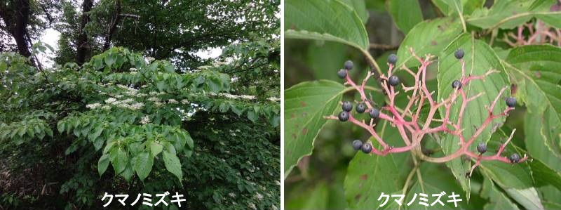 クマノミズキは本州、四国、九州に分布する落葉の高木です。三重県熊野地方に生育するミズキという和名がついているように、近畿以西に多いです。ミズキは水分を多く含む、水っぽい木であるとの意味ですが、生育には当然水分を必要とし、谷沿いなどの水分条件の良好な場所に生育する。生長は速く、条件がよい場所では1年間に1m以上も生長します。土壌が良ければ、伐採跡にも多数生育します。材は柔らかく、カミキリムシ類などの食害を受けやすい。谷沿いの攪乱地などに侵入し、急速に大きくなる樹木であると考えられます。ミズキとは葉が対生であること、葉柄が葉身の半分程度で短いこと、棚状の枝とならないことなどにより区別できます。岡山県ではクマノミズキは低地に分布し、県北の海抜の高い地域にはミズキが分布しています。