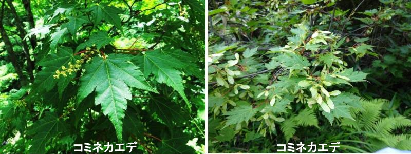 小葉カエデであるコミネカエデは、本州、九州、四国にある日本原産のスネークバークカエデ群のムクロジ科の顕花植物の一種です。その和名は小峰楓です。それは、高さ6〜10 mの小さな、時にはずんぐりした木で、細いアーチ型の枝があります。樹皮は最初は滑らかで縞模様で、成熟した木では粗く鈍い灰色になります。コミネカエデの花は6~7月に咲きます。上向けに突きだした総状花序に10個以上の小さな花が集まっています。5mm程度の小さな花ですが、よく見ると花弁よりも長い8個の雄しべが勢い良く出ています。コミネカエデの葉は、普通5裂し、鋸歯の切れ込みが美しいので、すぐに覚えられます。特に、葉の先端が長く尾状に伸びることでミネカエデと区別されます。ナンゴクミネカエデとの区別はやや難しいですが、葉の基部の切れ込みがナンゴクミネカエデでは大きく、7裂しているように見えます。また、コミネカエデの方が花弁の枚数が少なく、翼果の開き具合が大きいです。葉は対生で、葉身は 長さ6~9cm、幅5~8cmの長五角形です。葉柄は2~5cmです。掌状に5深裂し、裂片は卵状披針形で、先端は尾状に長く伸びて鋭く尖り、縁には重きょ歯と欠刻状きょ歯があります。基部は心臓形で、基部から5~7本の掌状脈が出ています。