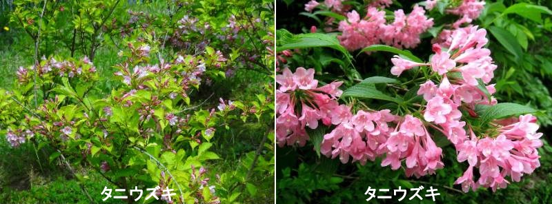 タニウツギは、北海道~本州の山野に自生する落葉性の低木です。沢や谷間の水が流れているそばによく自生し、そこからタニウツギの名前があります。「ウツギ」と名前が付いていますが、卯の花の別名でも親しまれているウツギはユキノシタ科の植物でスイカズラ科の本種とは別のものです。ウツギ同様、枝の髄(ずい)の部分がチクワのように中空になるのでこの名前が付いたのではないかと思われます。アジサイが咲き始める初夏にろうと状のかわいらしい花を咲かせます。花は葉の付け根に2~3輪ずつまとまって付き、日当たりの良い場所で育った株は枝を覆うほどたくさんの花を咲かせてくれます。葉はやや先のとがった卵形でフチに小さなギザギザがあり、裏面は白い毛が密生し、枝をはさんで同じ位置に2枚の葉が左右に付きます。品種に白い花を咲かせるシロバナタニウツギ〔f. albiflora〕があります。花色が白→紫→紅色と変化するハコネウツギや濃い紅ピンク色の花を付けるオオバニウツギなどの近縁種も庭木として親しまれています。