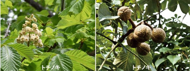 「トチノキ」とは、「トチノキ科の落葉高木」のことです。北海道から九州の山地まで幅広く生息しています。実は食用として使用し、木の部分は家具や器具などの建築材料として、さらに樹を庭木として使用することができます。ブナ帯の沢沿いに生え、車輪状の葉が大きい落葉高木。春から初夏にかけて、上向きに円すい状の大型の花を多数咲かせ、ミツバチやハナバチ類の蜜源になります。秋、クリよりもツヤヤカで大きい実をたくさんつけます。デンプン質が豊富で、天日乾燥させると10年以上長期保存できることから、縄文時代から食用として利用されています。トチノキの葉はギザギサ(鋸歯)がありますが、ホオノキの葉はギザギサがなく滑らか(全縁)です。トチノキは、手のひらを広げたような葉の付き方をしています。もともと1枚の葉でしたのが5枚の小葉に分かれたと考えることができます。だから、5~7枚の小葉の付け根はぴったり1カ所に集まっています。ホオノキは、複数の葉が集まって掌状複葉のように見えますが、よく見ると、それぞれの葉の付け根が微妙にずれています。下から見ると輪状に葉がついているように見えます。 名前の由来は、いろんな説がありますが、アイヌ語由来説が有力です。アイヌの人々はトチの実を「トチ」、トチノキの幹を「トチニ」と呼んだことに由来しています。ほかに、実がたくさんなるので、「十千(トチ)」などがあります。