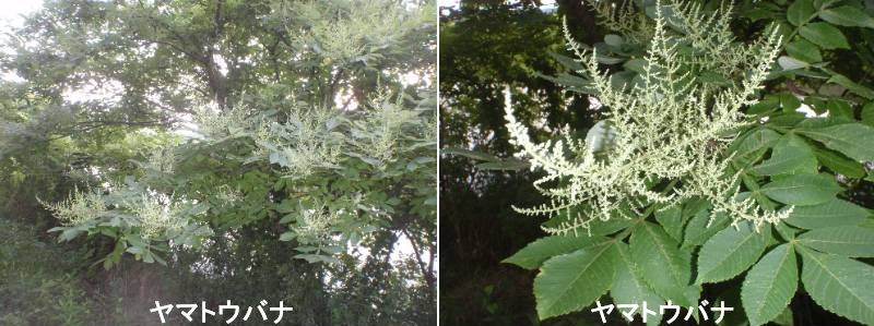 ヤマブキショウマは、北海道、本州、四国及び九州に分布するバラ科の多年草で、山地の林縁や谷筋、草原などに自生しています。葉がヤマブキに、根茎がトリアシショウマに似ているとして、ヤマブキショウマと名付けられました。ヤマブキショウマの開花は6~8月です。茎先から伸びた円錐状の花穂に、白色の小花が多数集まって咲きますが、ヤマブキショウマは雌雄異株で雄株には雄花だけが、雌株には雌花だけが咲きます。花弁はヘラ形で5枚。雄花の雄しべは20本で、花弁よりも長いため花穂全体が雌花よりも大きくて派手に見えます。雌花にも雄しべはありますが花粉はつけません。雌花の雌しべは3本で子房も3個。花の後には袋状の果実が3つ連なります。葉は卵形の小葉が9枚集まって羽根状になります。小葉は先端が尾状に尖り、縁には粗いギザギザがあります。トリアシショウマに似ていますが、平行する葉脈(側脈)が明瞭で、葉柄は長く、茎や葉に毛がないため表面に光沢があります。