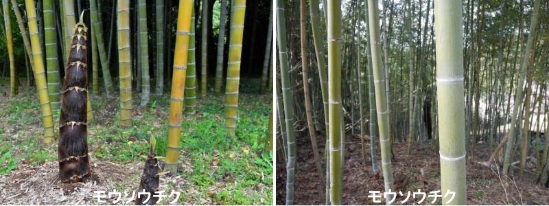 モウソウチクはは直径20㎝ほどにもなり、日本に生育するタケ類の中では最大となる種です。中国大陸が原産地とされますが、今日では寒冷地では少ないものの、日本全国に植栽されています。当園のある岡山県倉敷市真備町地域でも栽培が盛んで岡山県における一大産地となっています。筍は岡山県南部では4月中旬ごろ発生のピークを迎え、地中に長く伸びた地下茎から発生します。筍の皮を剥いた際、下部に赤い点状の突起が並んでいるのを見たことがある方もおられるかと思いますが、これは根の成長点で、筍の発生初期には、地下茎から養分や水分を得ているため、根は未発達で伸長していませんが、筍が地上に顔を出して数日のうちには太い根が筍の下部より伸長しだします。食用にするには、根が伸長していないものほど柔らかくて美味しいため、筍の産地では地上に筍が顔を出す直前に見つけ、掘り取るということです。花はめったに咲くことがありませんが、まれに一部の枝に花をつけることがあり、話題となることがあります。タケ・ササ類には一斉に花をつけ(一斉開花)、開花して種子を生産した後は地下茎を含めた全体が枯死(一斉枯死)する現象があることが知られており、マダケではその周期が120年との報告があります。モウソウチクでは部分開花した花の種子から栽培した集団が67年目に一斉開花・枯死したとの記録がありますが、これはむしろ特殊な事例で、実際には本種の一斉開花・枯死の周期はもっと長いものであるようです。